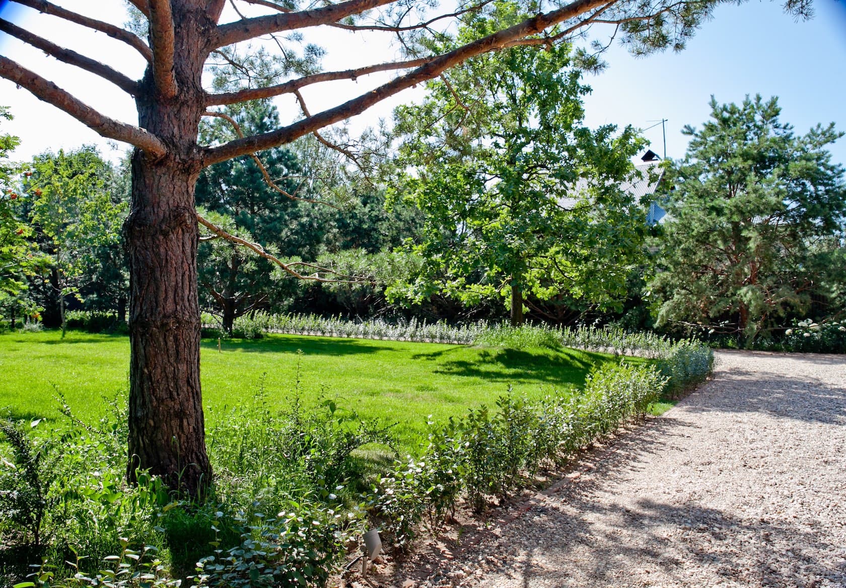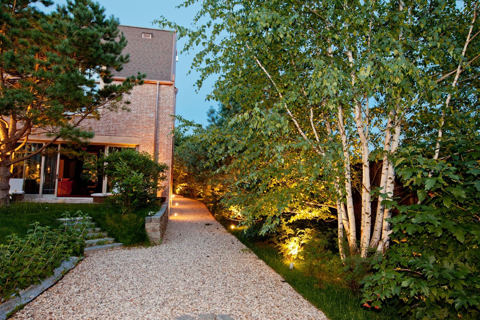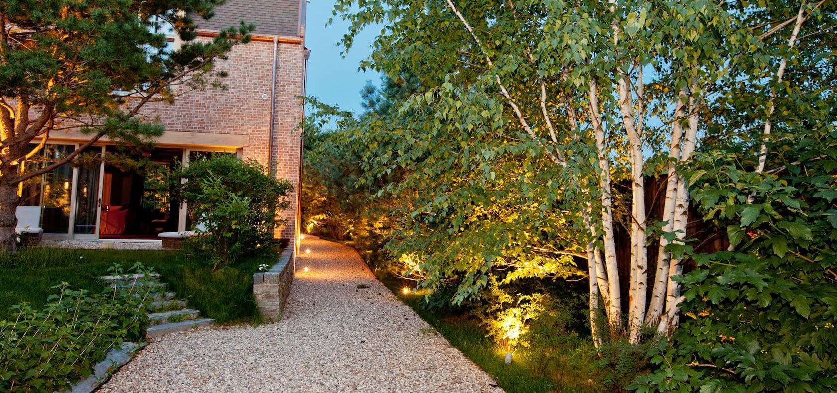 Работы по частичному обновлению грунта, прокладка дренажной системы, установка системы автоматического полива, создание дорожно-тропиночной системы – гравийные дорожки, посадка крупномерных деревьев, кустарников, цветников, укладка рулонного газона, установка освещения.