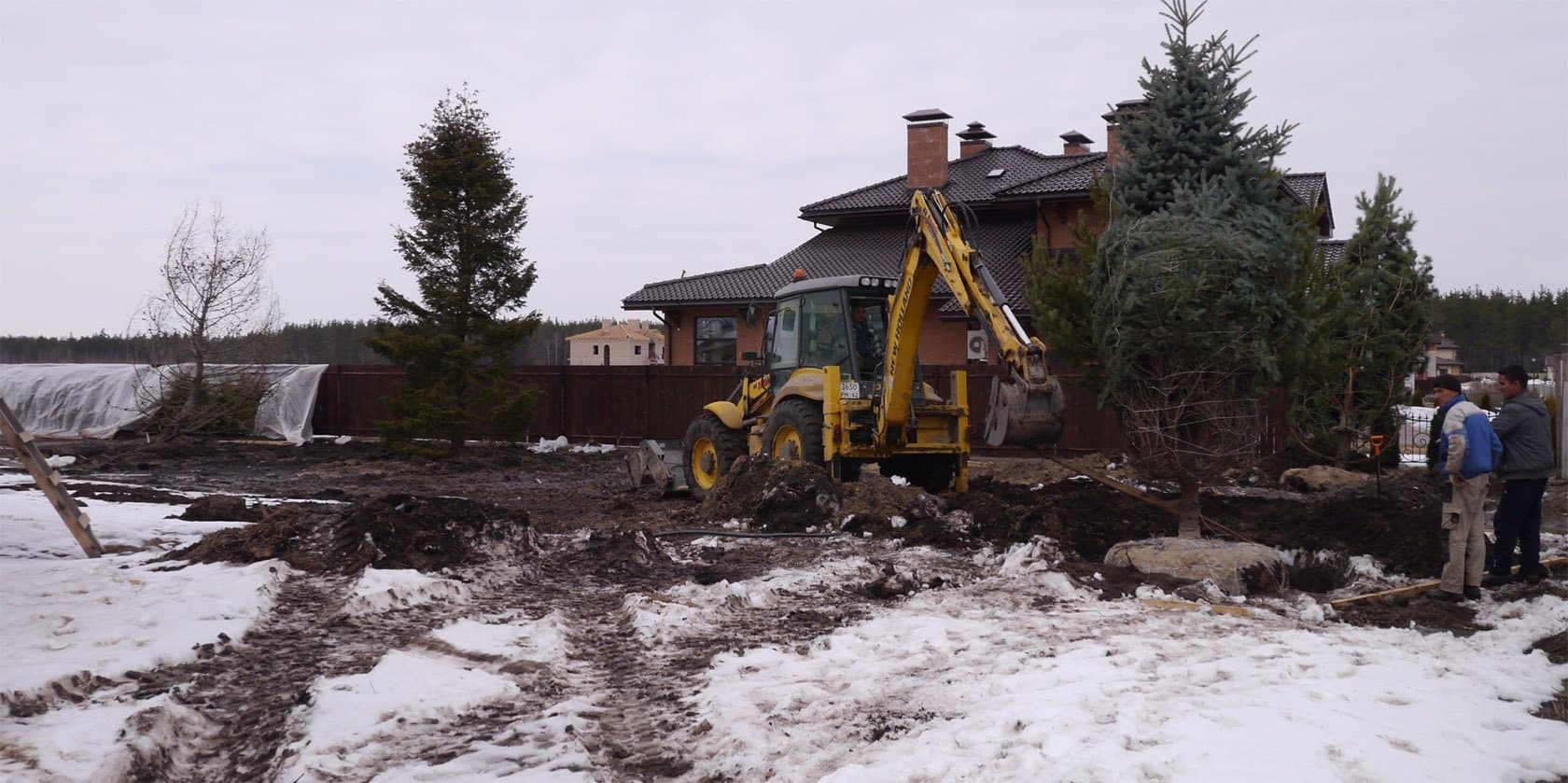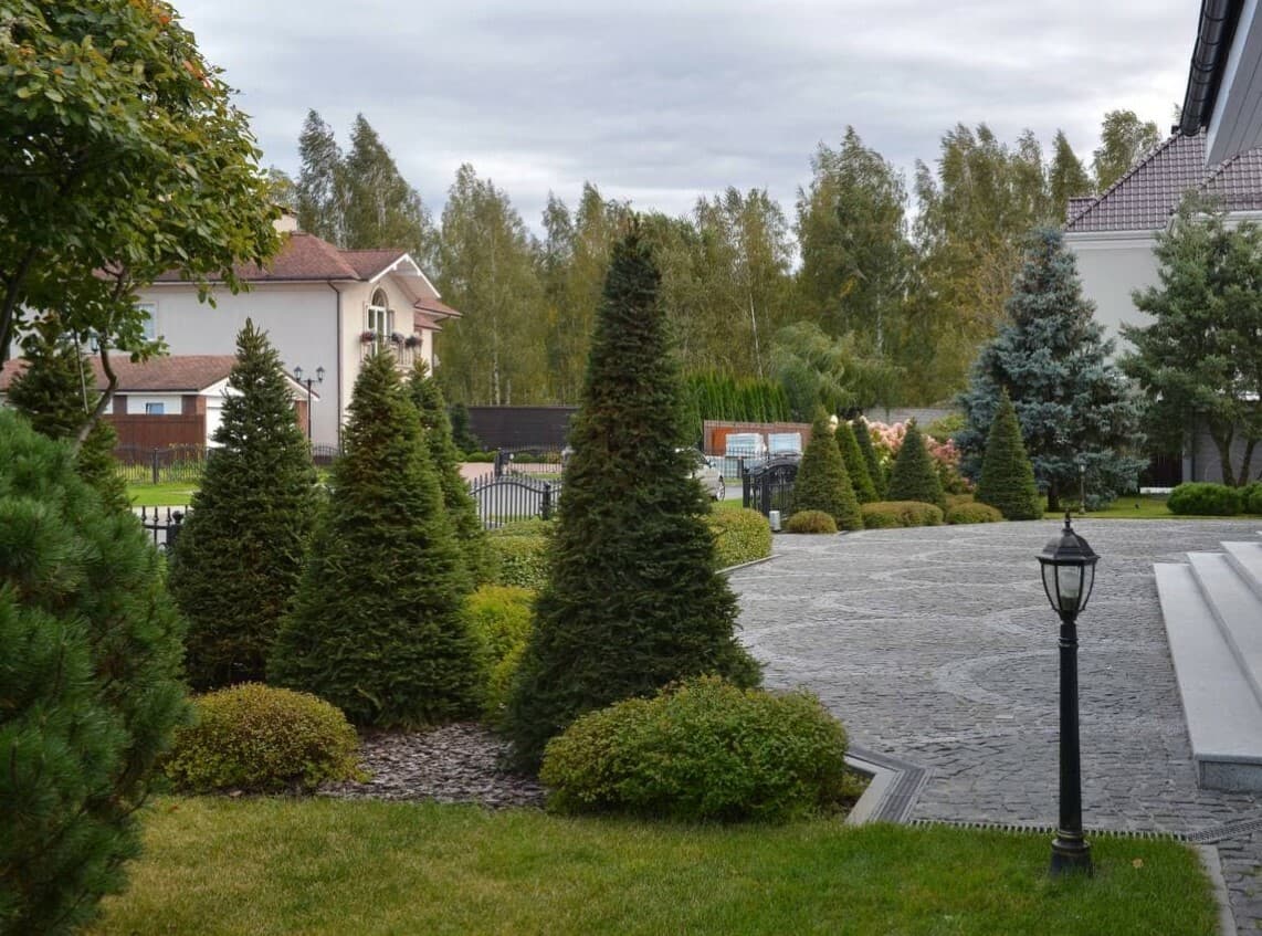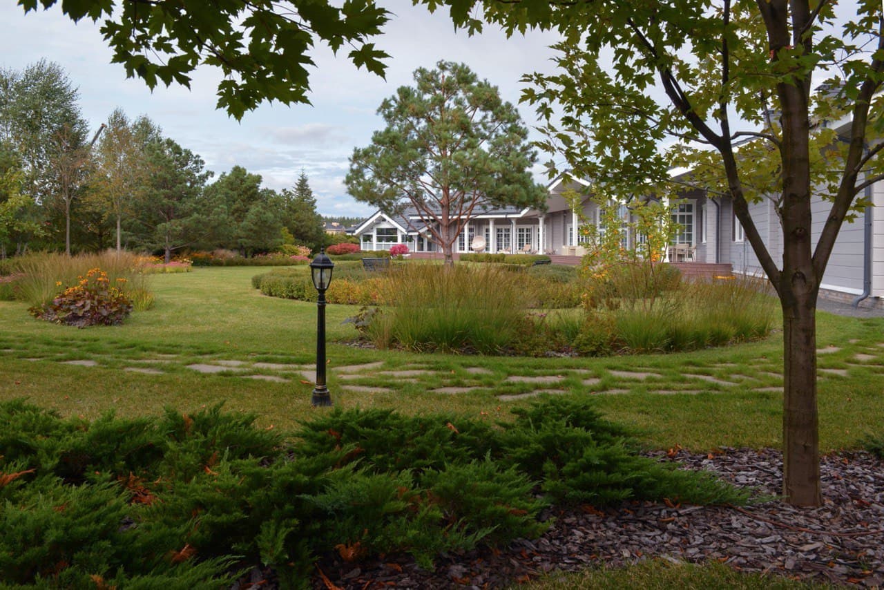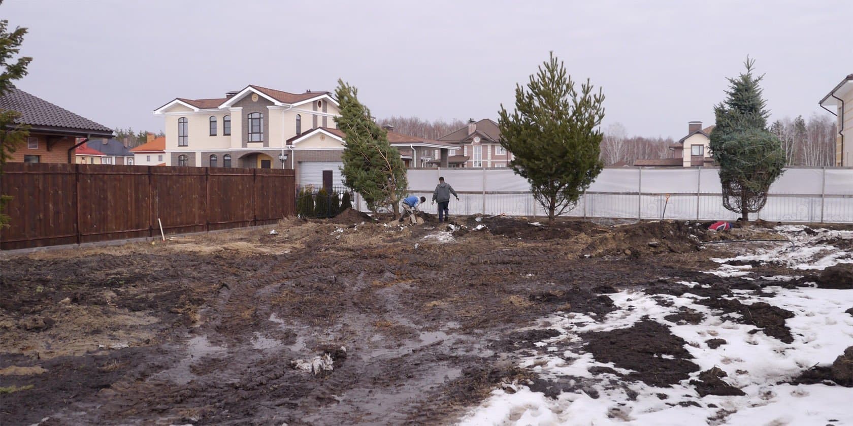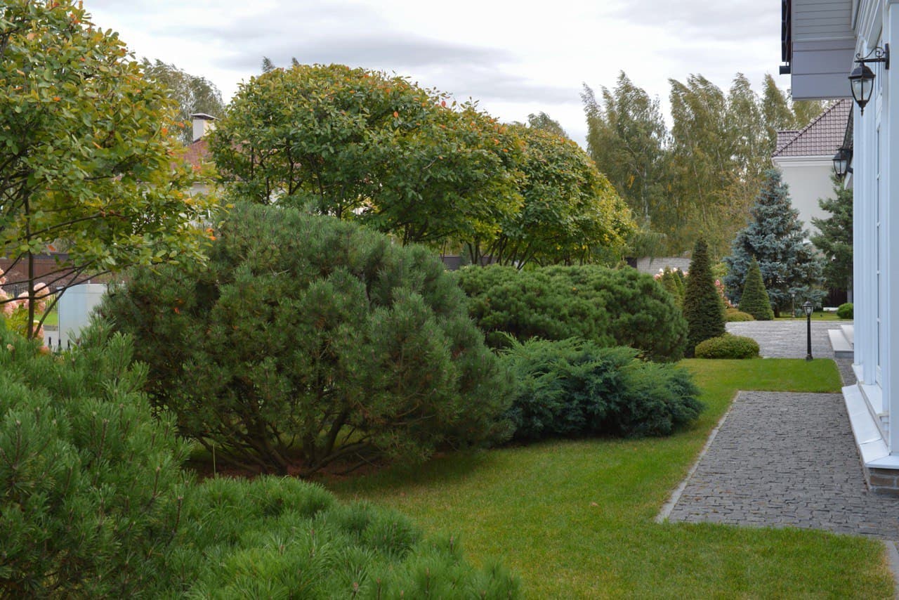 Работы по частичному обновлению грунта, прокладка дренажной системы, установка системы автоматического полива, создание дорожно-тропиночной системы – укладка натурального камня на бетонное основание, посадка крупномерных деревьев, кустарников, цветников, укладка рулонного газона, установка освещения.