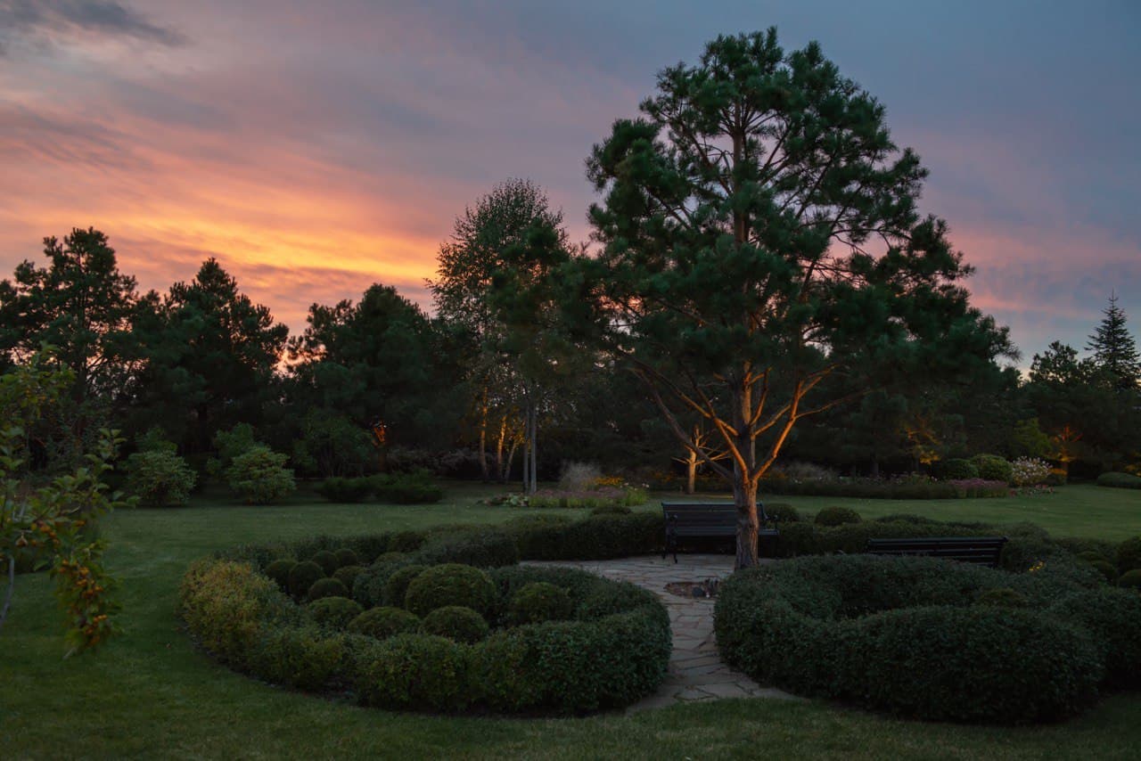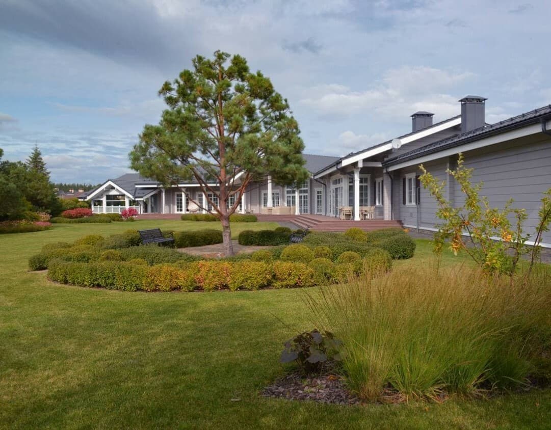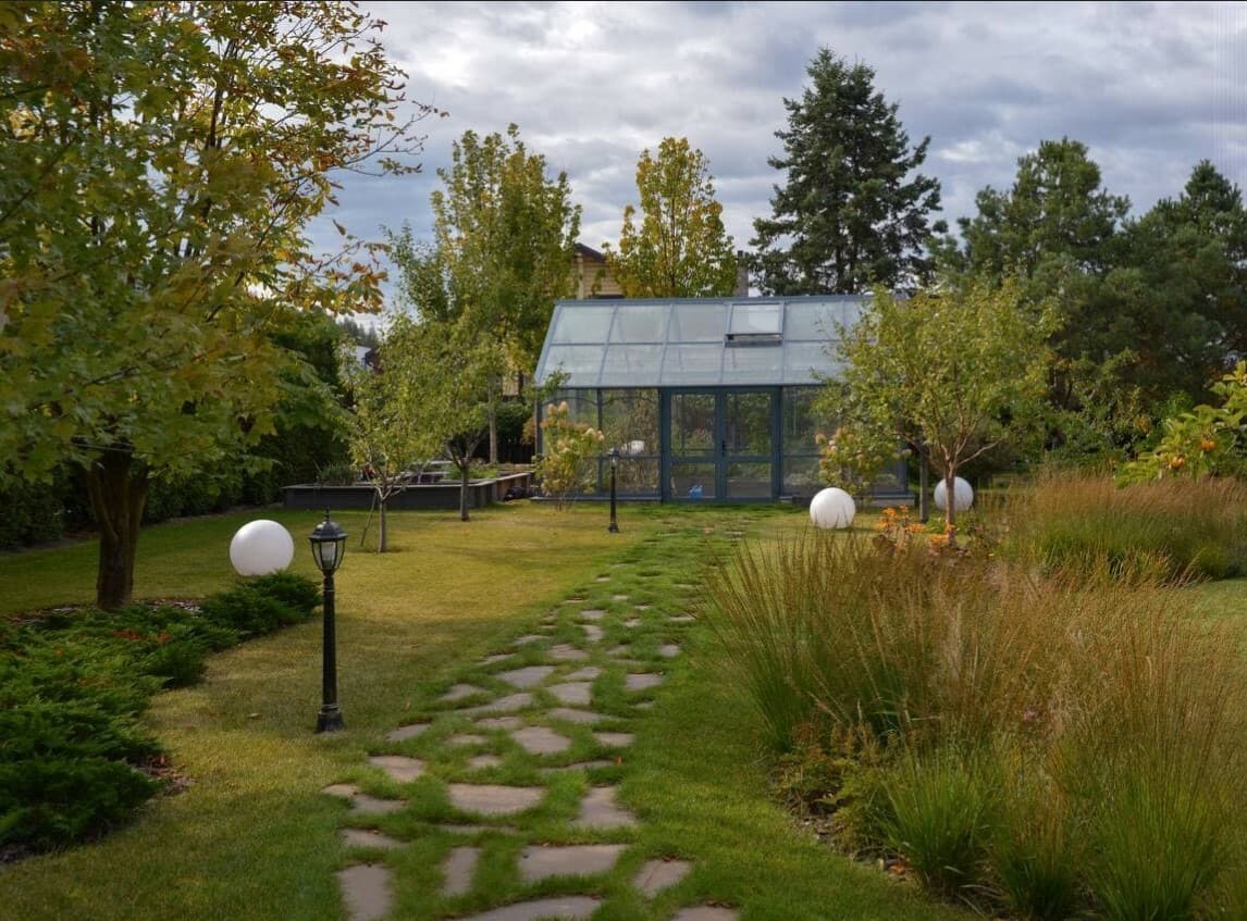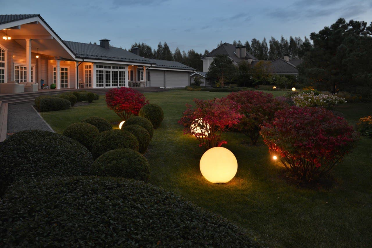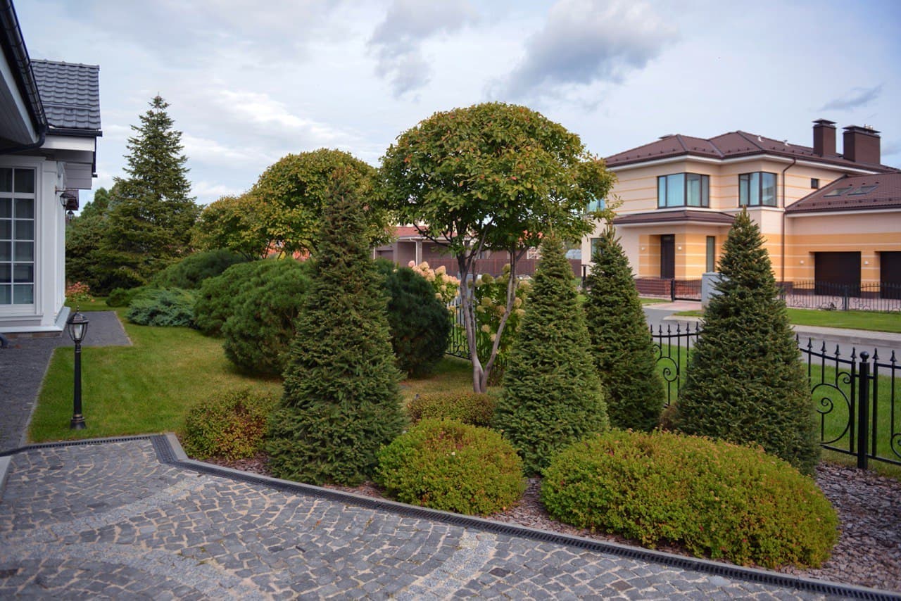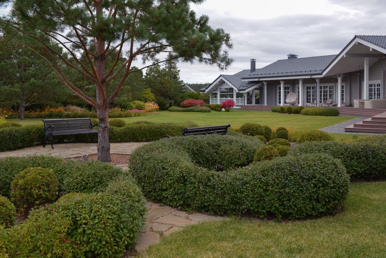 Работы по частичному обновлению грунта, прокладка дренажной системы, установка системы автоматического полива, создание дорожно-тропиночной системы – укладка натурального камня на бетонное основание, посадка крупномерных деревьев, кустарников, цветников, укладка рулонного газона, установка освещения.