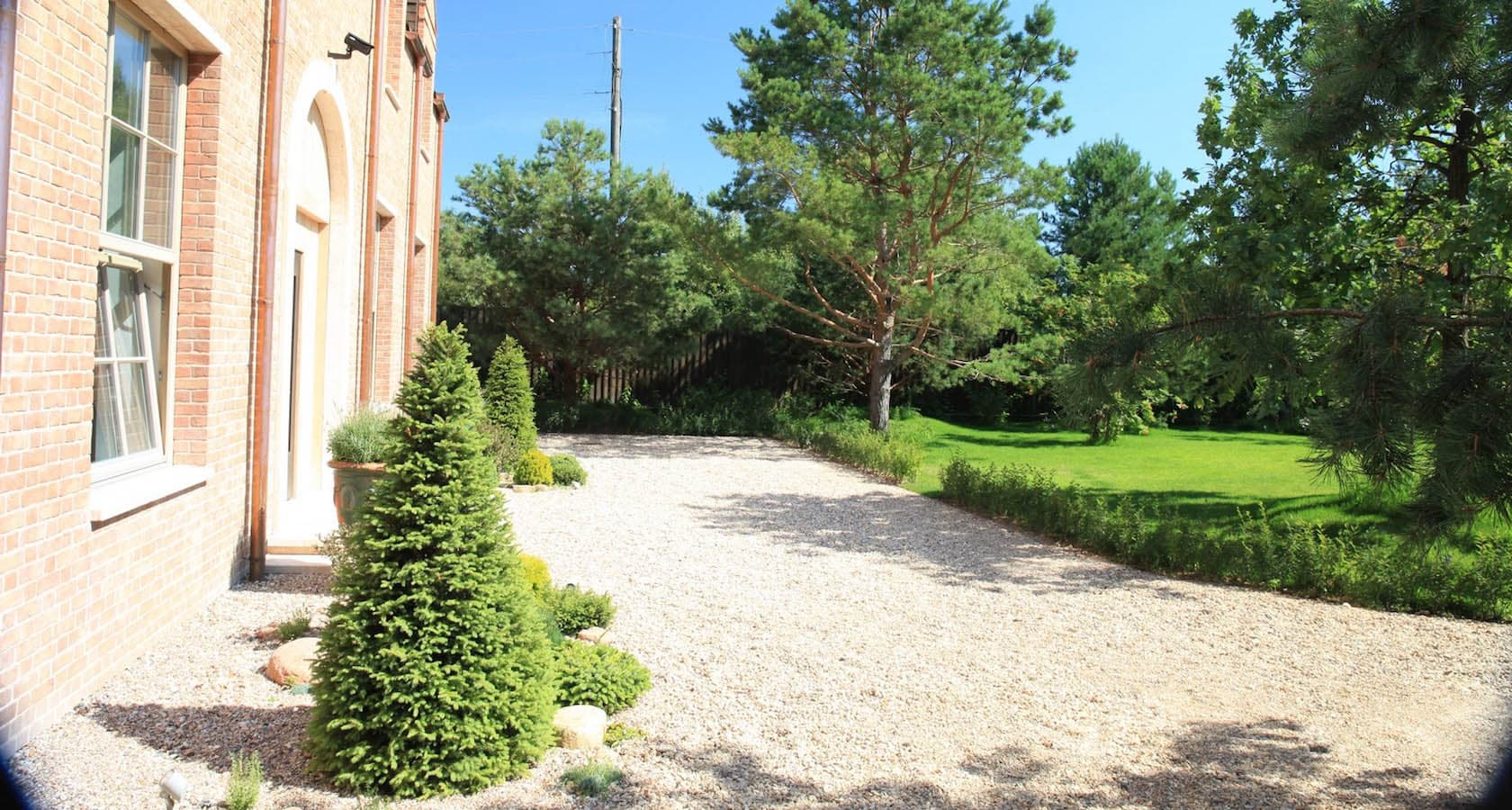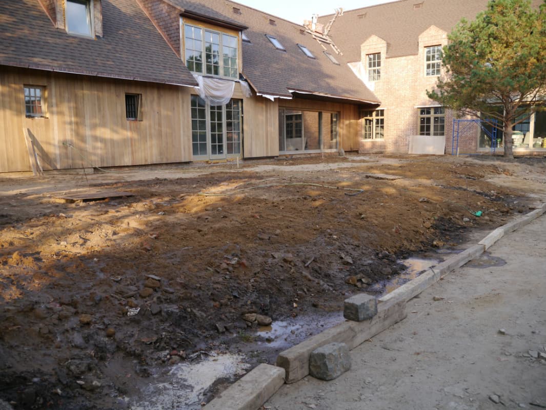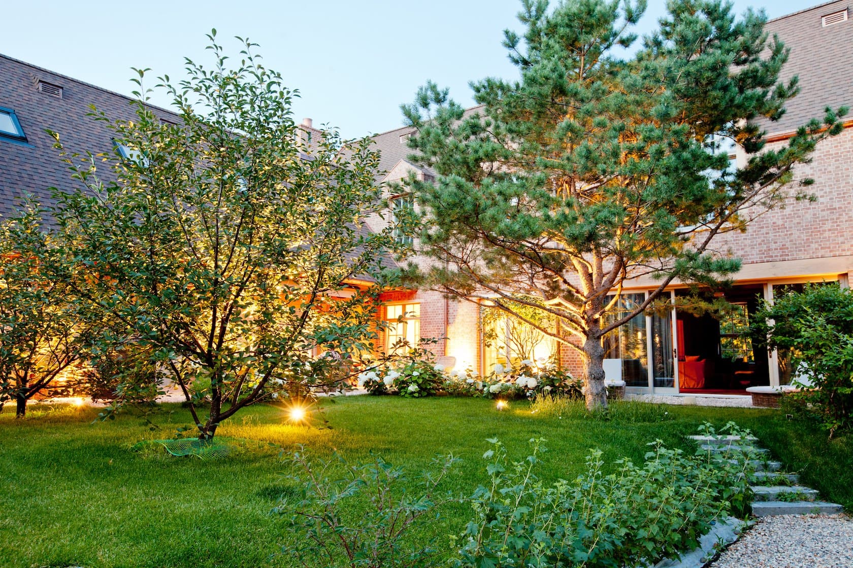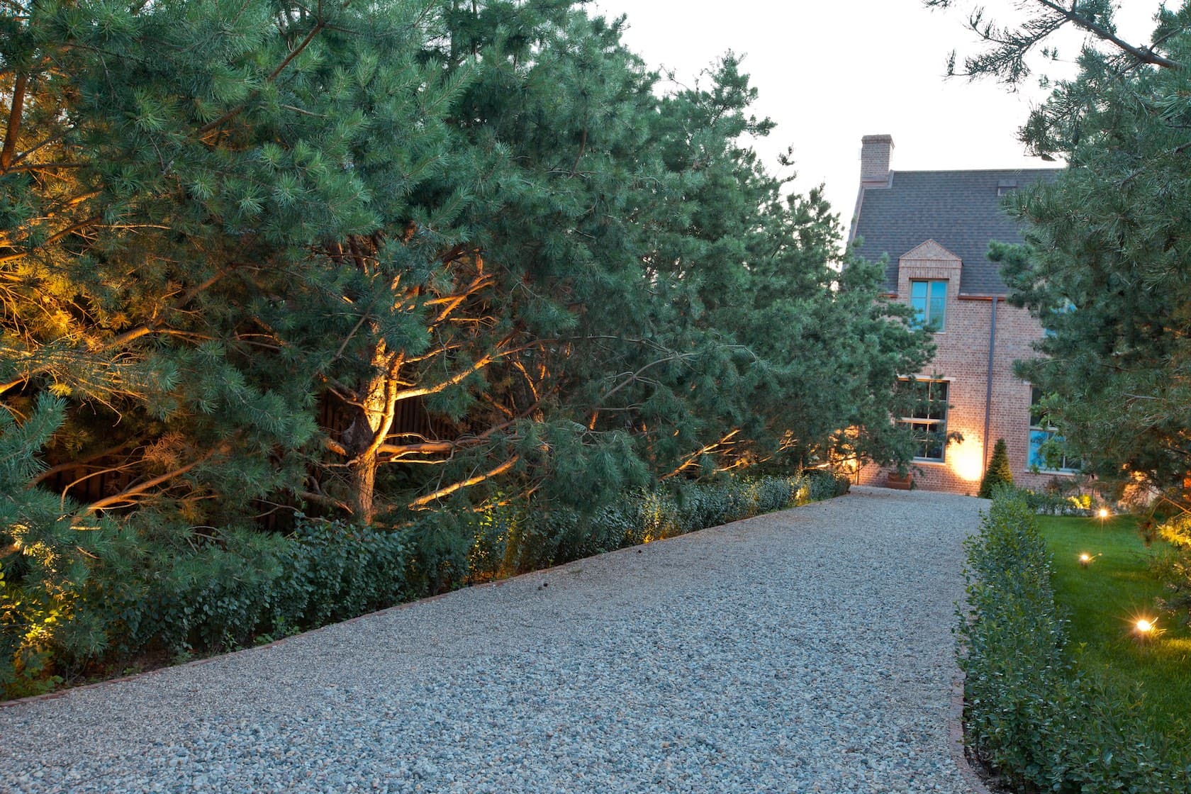Работы по частичному обновлению грунта, прокладка дренажной системы, установка системы автоматического полива, создание дорожно-тропиночной системы – гравийные дорожки, посадка крупномерных деревьев, кустарников, цветников, укладка рулонного газона, установка освещения.