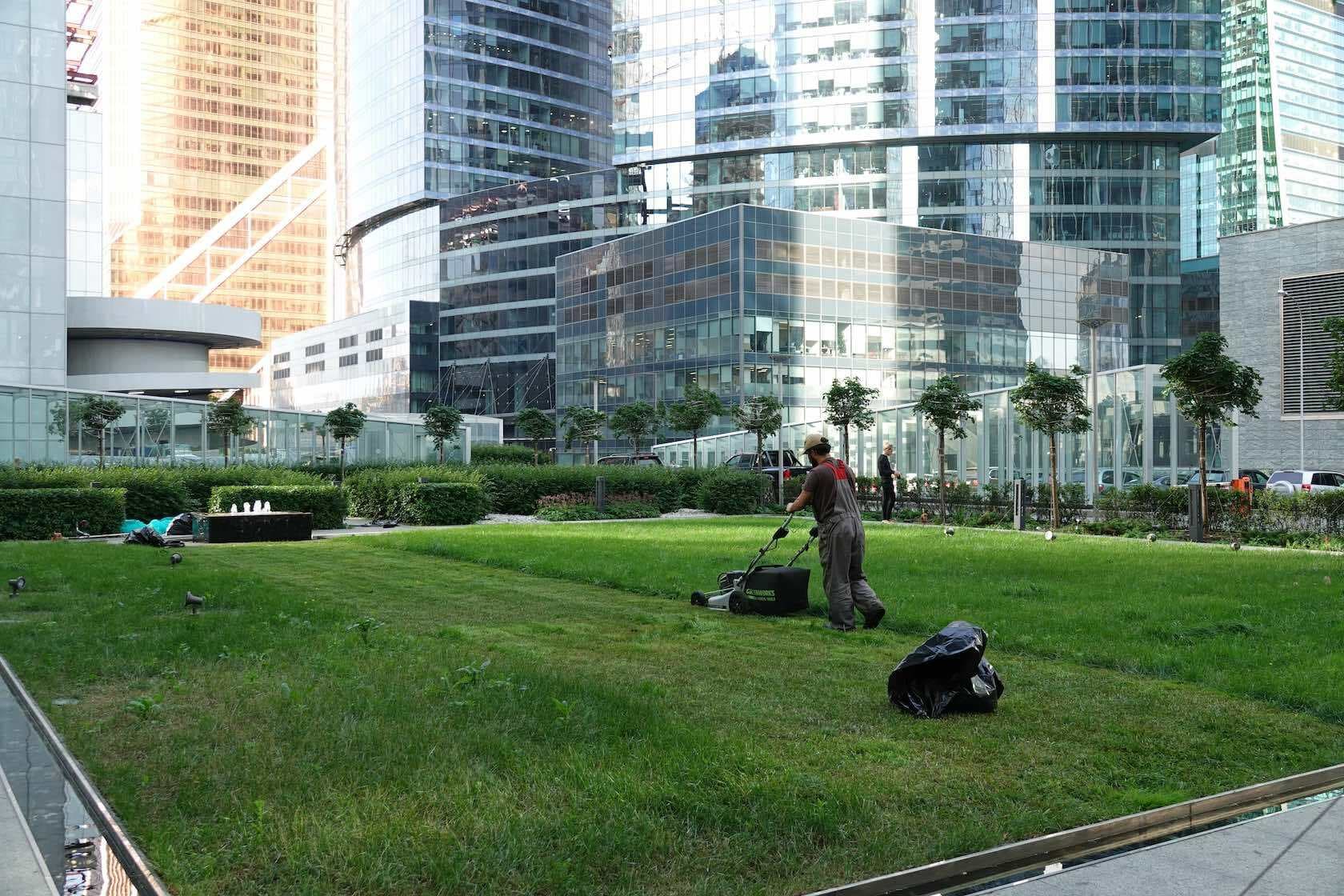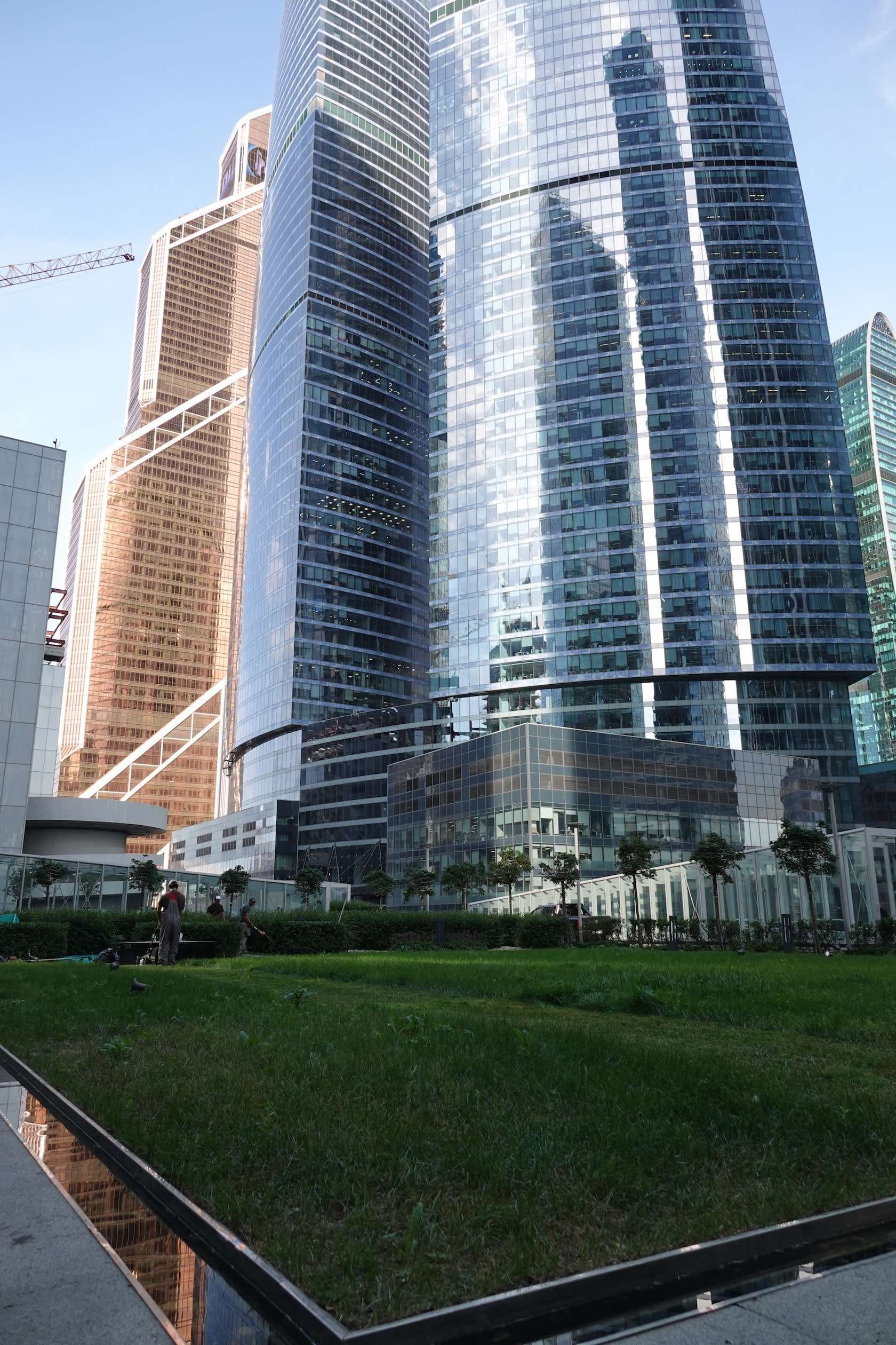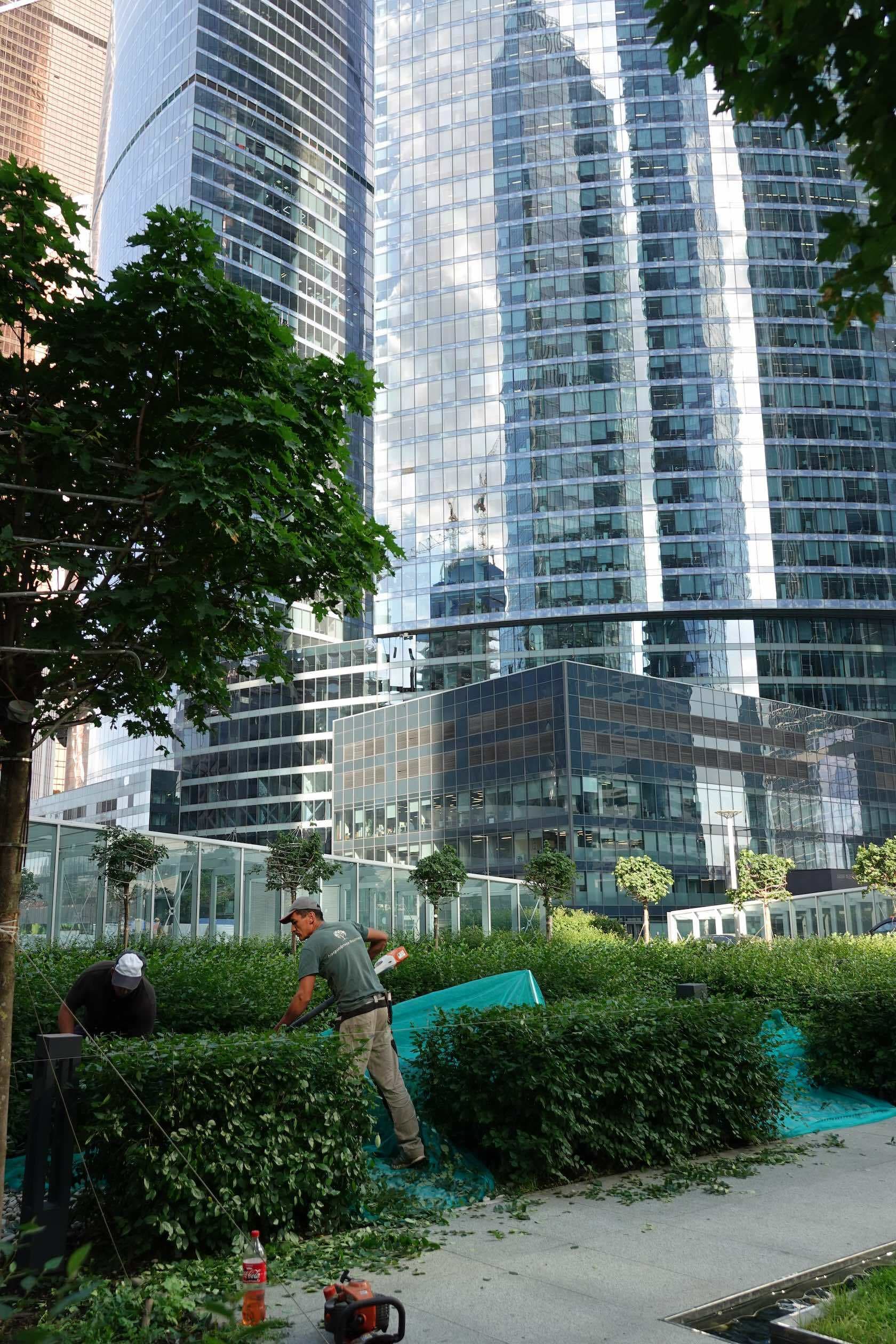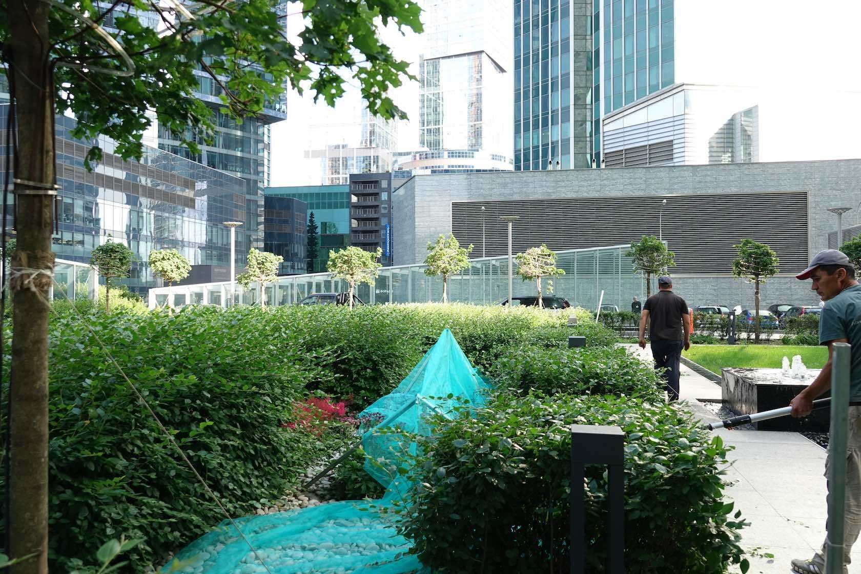 Нам поступило предложение взять на уход зеленую территорию вокруг этих небоскребов Москва Сити! Основной запрос был на содержание газона и решение проблем с посадками. Место открытое, очень сильно подвергается ветру, лето было жаркое и растения горели, хотя полив техническая служба обеспечивала по нормам. В городских посадках очень много нюансов. Мы буквально гонялись за каждым листиком. Ведь в центре Столицы все должно быть идеально!