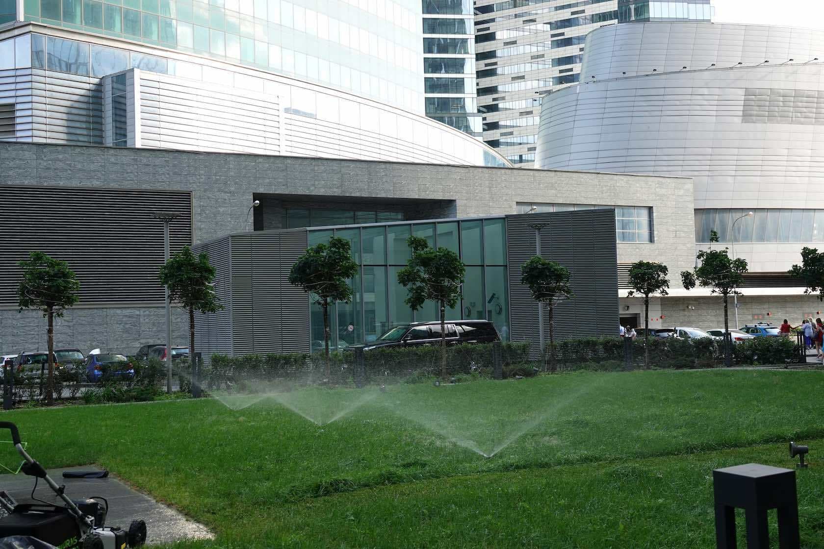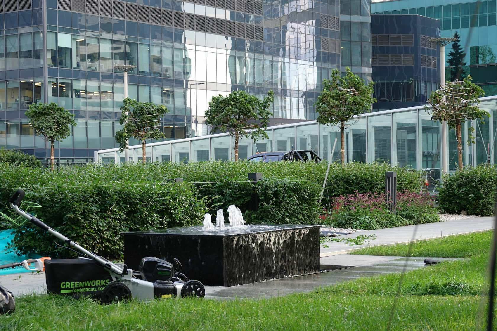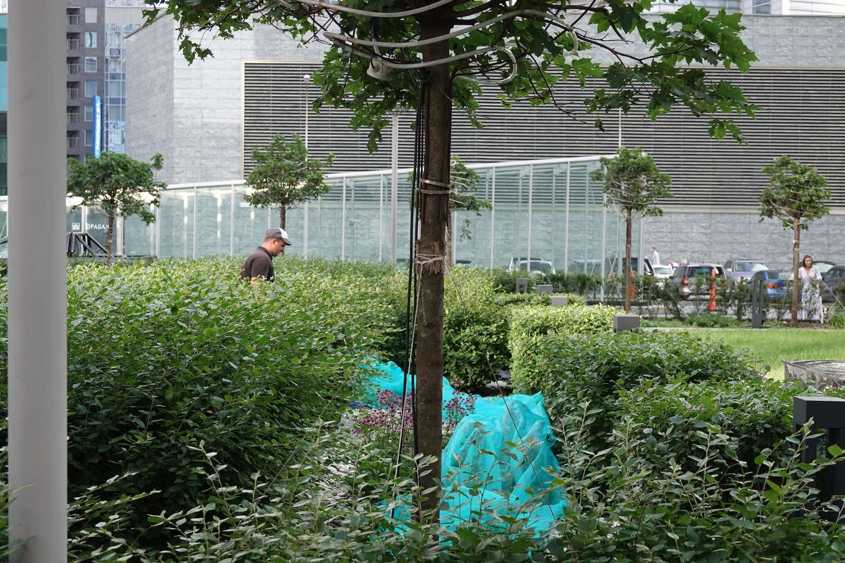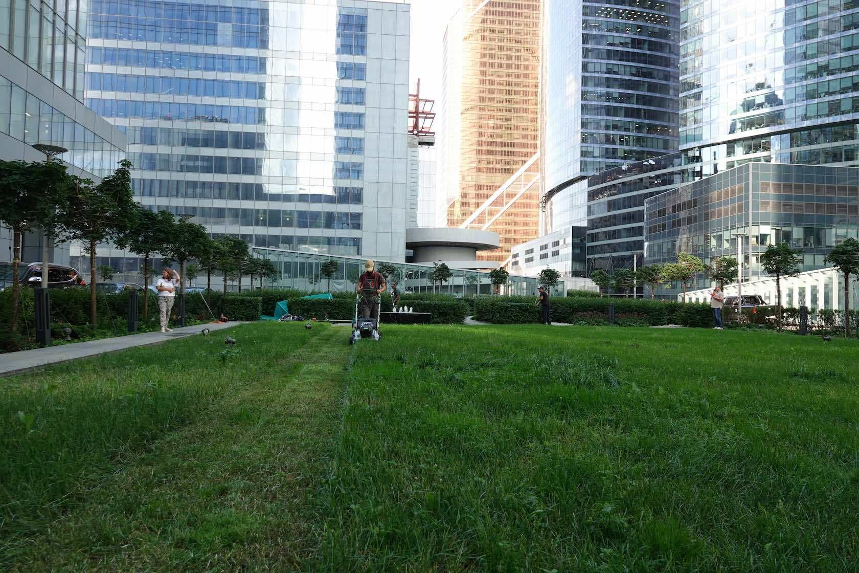 Нам поступило предложение взять на уход зеленую территорию вокруг этих небоскребов Москва Сити! Основной запрос был на содержание газона и решение проблем с посадками. Место открытое, очень сильно подвергается ветру, лето было жаркое и растения горели, хотя полив техническая служба обеспечивала по нормам. В городских посадках очень много нюансов. Мы буквально гонялись за каждым листиком. Ведь в центре Столицы все должно быть идеально!