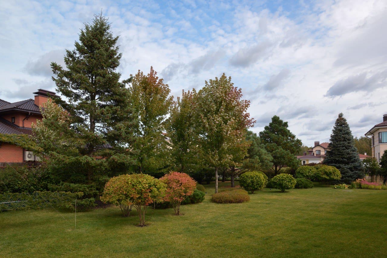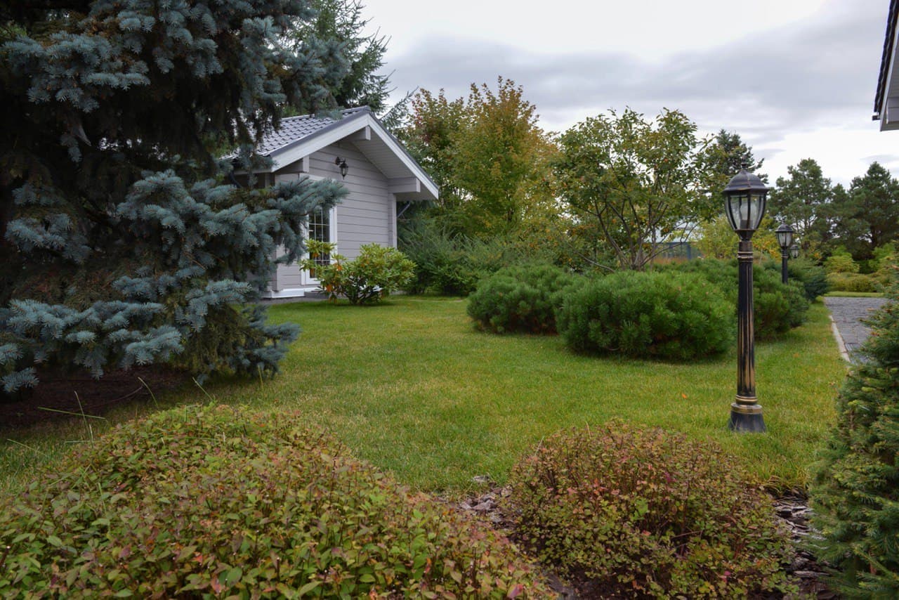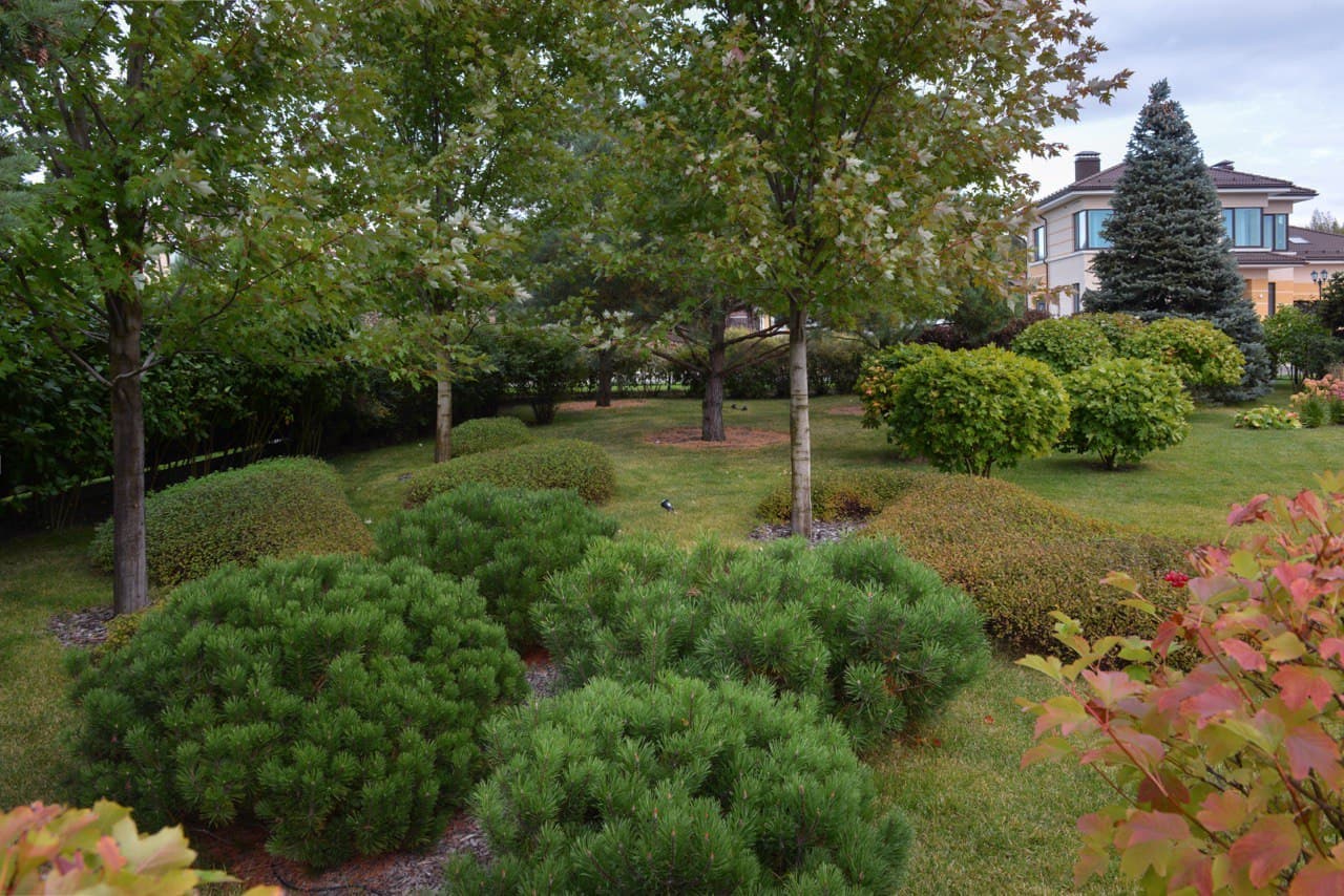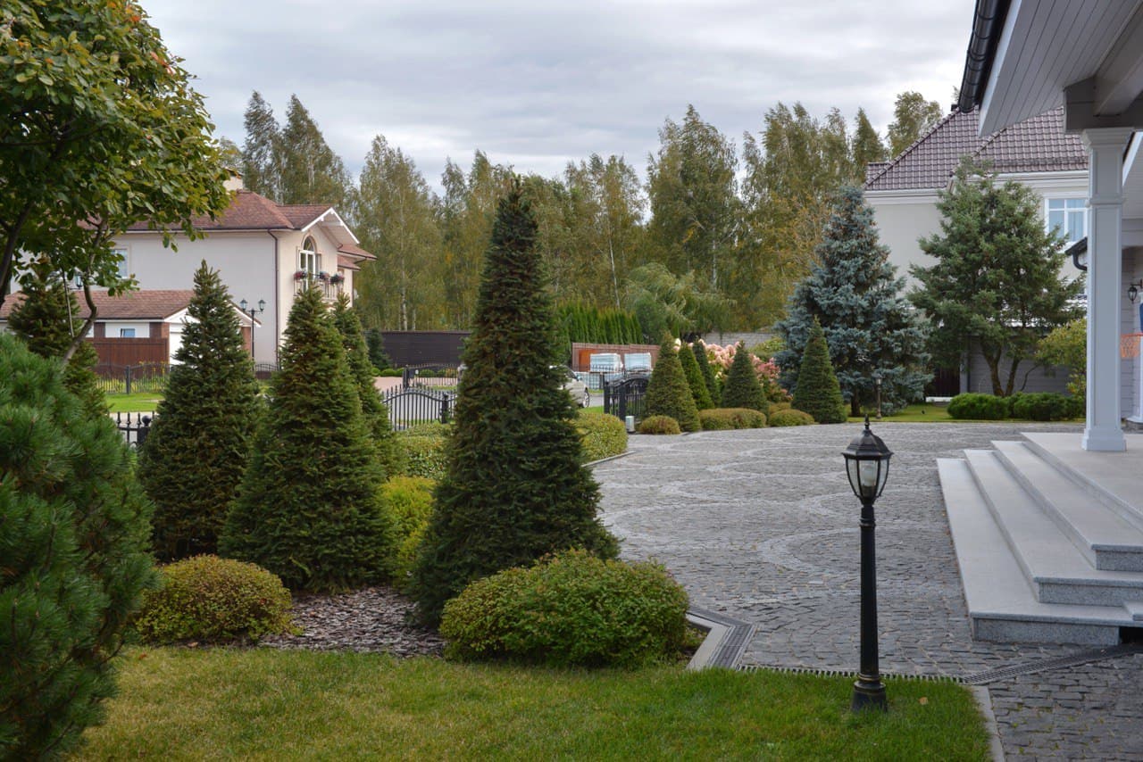 Работы по частичному обновлению грунта, прокладка дренажной системы, установка системы автоматического полива, создание дорожно-тропиночной системы – укладка натурального камня на бетонное основание, посадка крупномерных деревьев, кустарников, цветников, укладка рулонного газона, установка освещения.