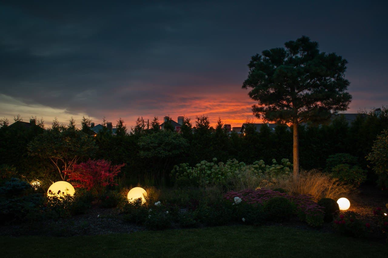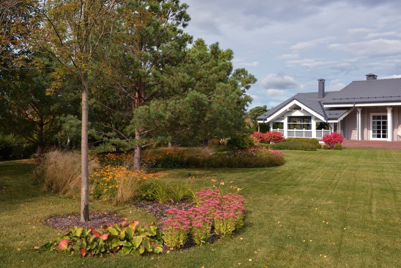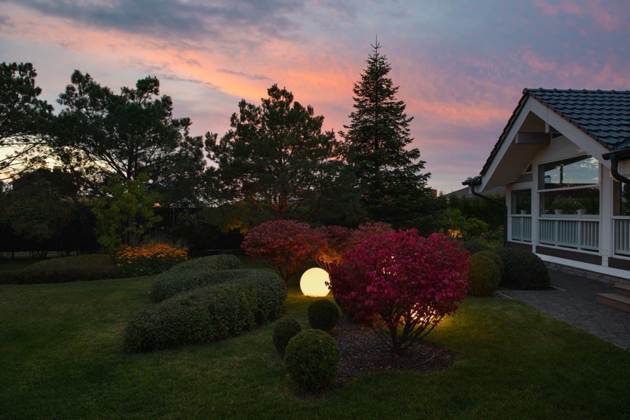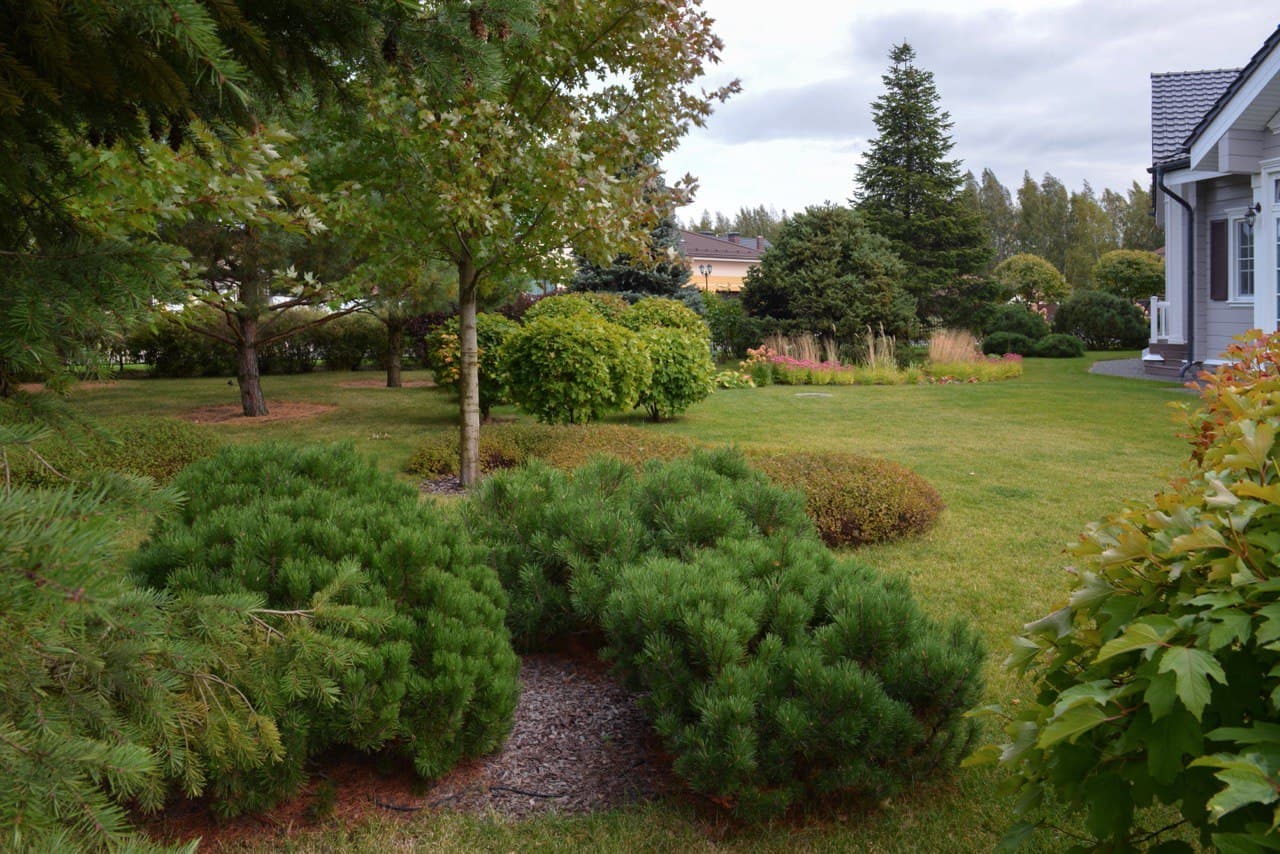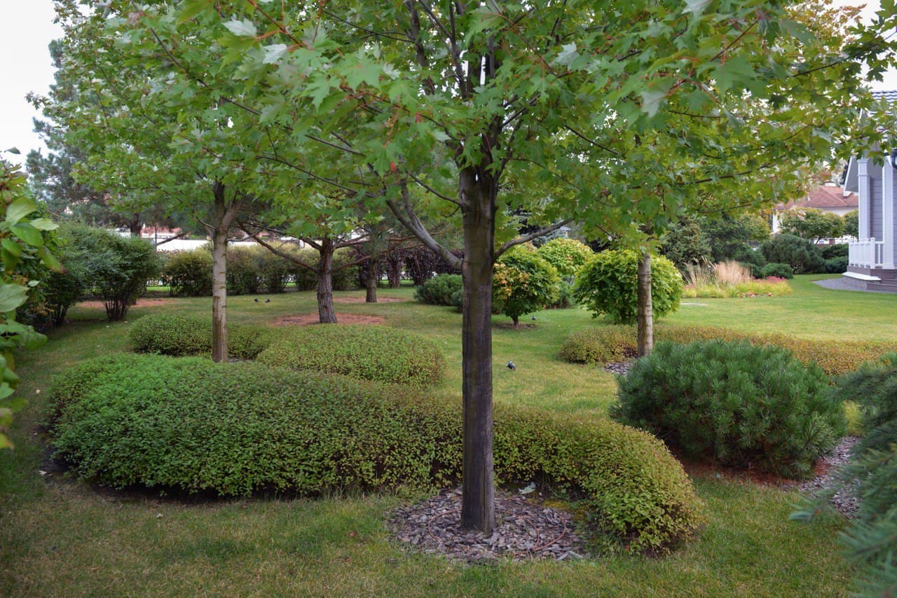 Работы по частичному обновлению грунта, прокладка дренажной системы, установка системы автоматического полива, создание дорожно-тропиночной системы – укладка натурального камня на бетонное основание, посадка крупномерных деревьев, кустарников, цветников, укладка рулонного газона, установка освещения.