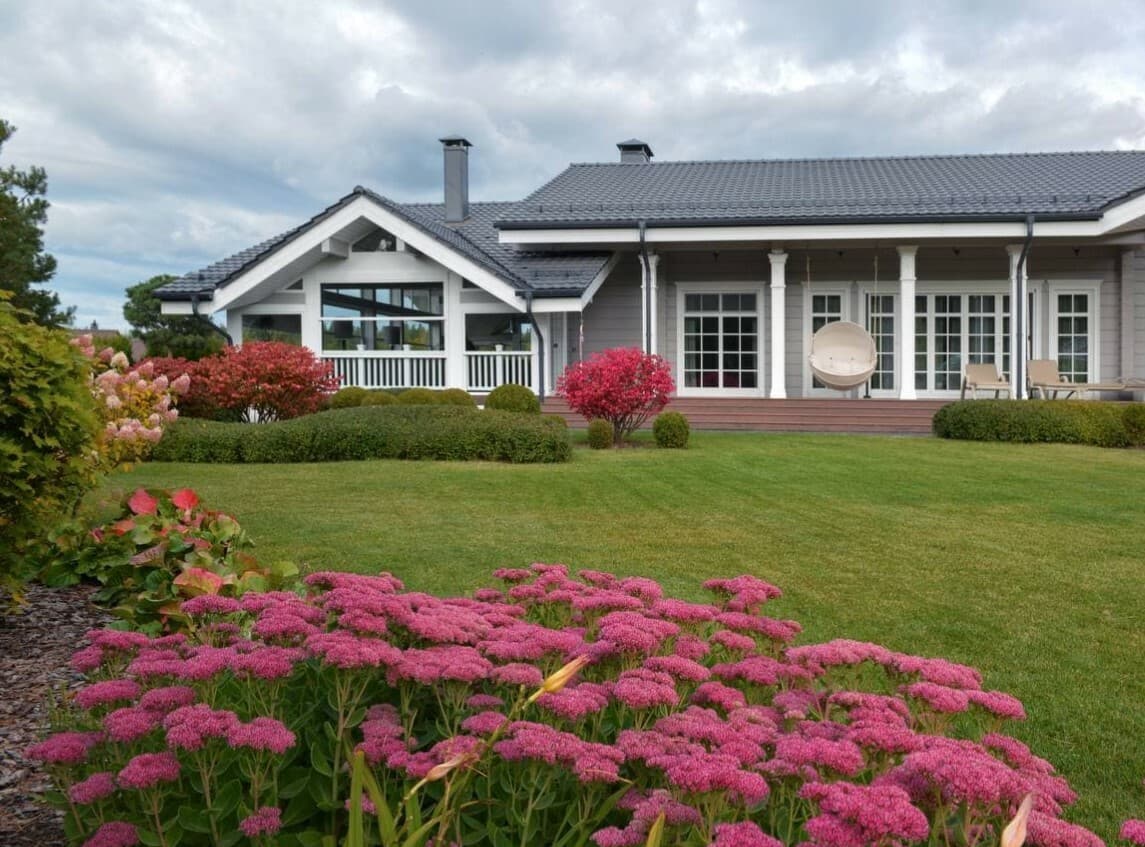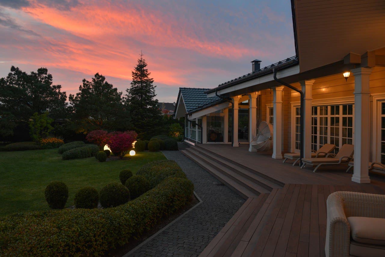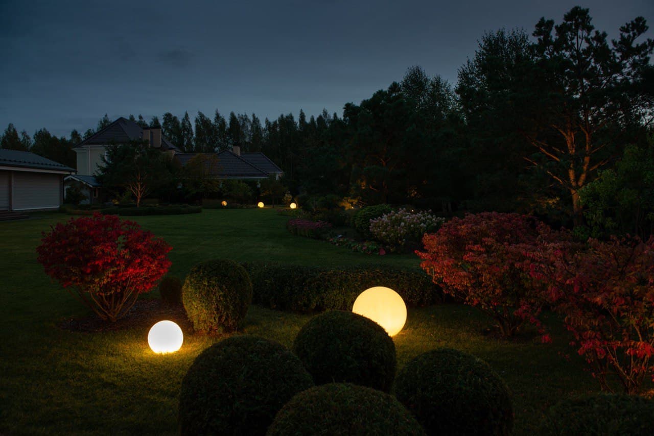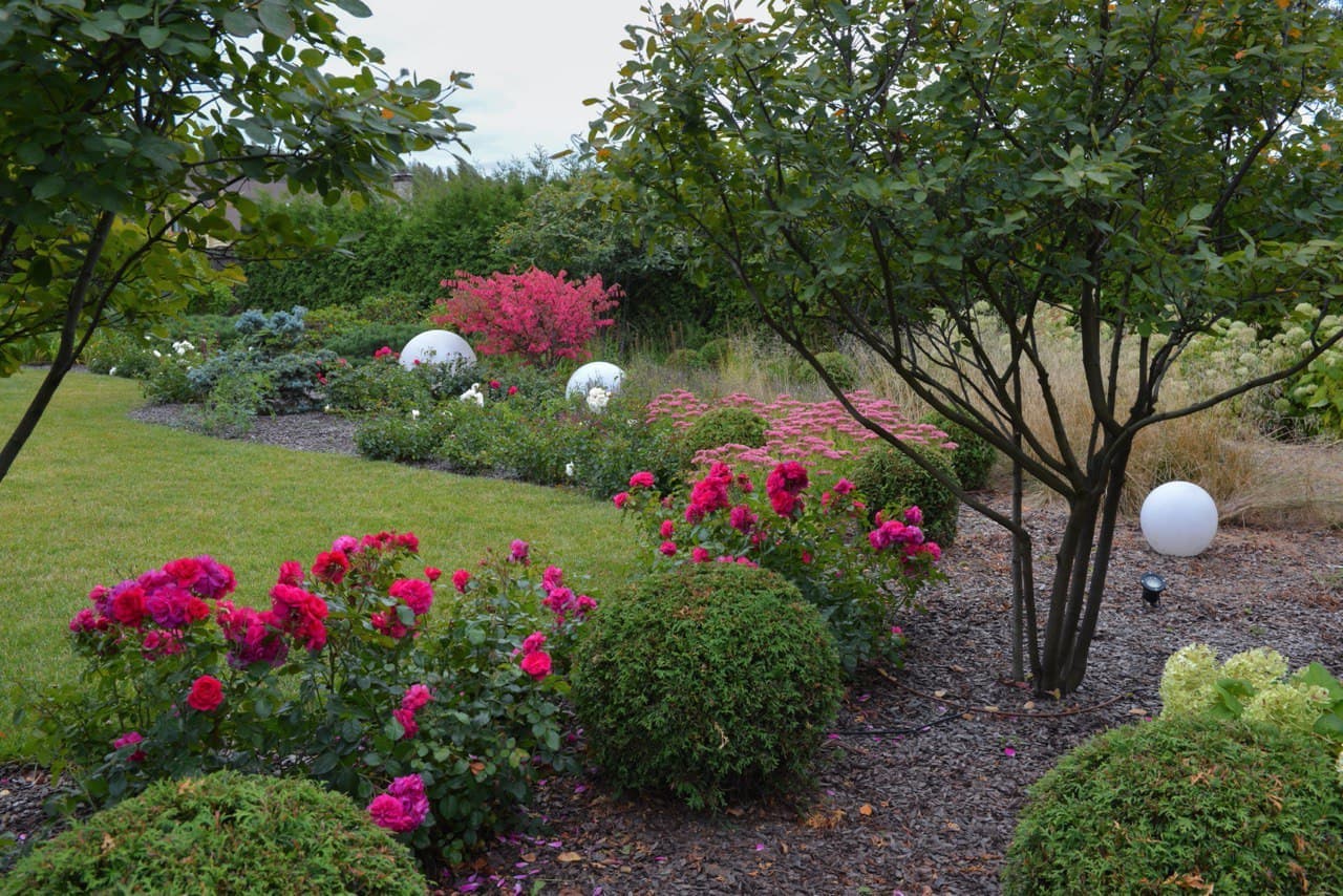 Работы по частичному обновлению грунта, прокладка дренажной системы, установка системы автоматического полива, создание дорожно-тропиночной системы – укладка натурального камня на бетонное основание, посадка крупномерных деревьев, кустарников, цветников, укладка рулонного газона, установка освещения.
